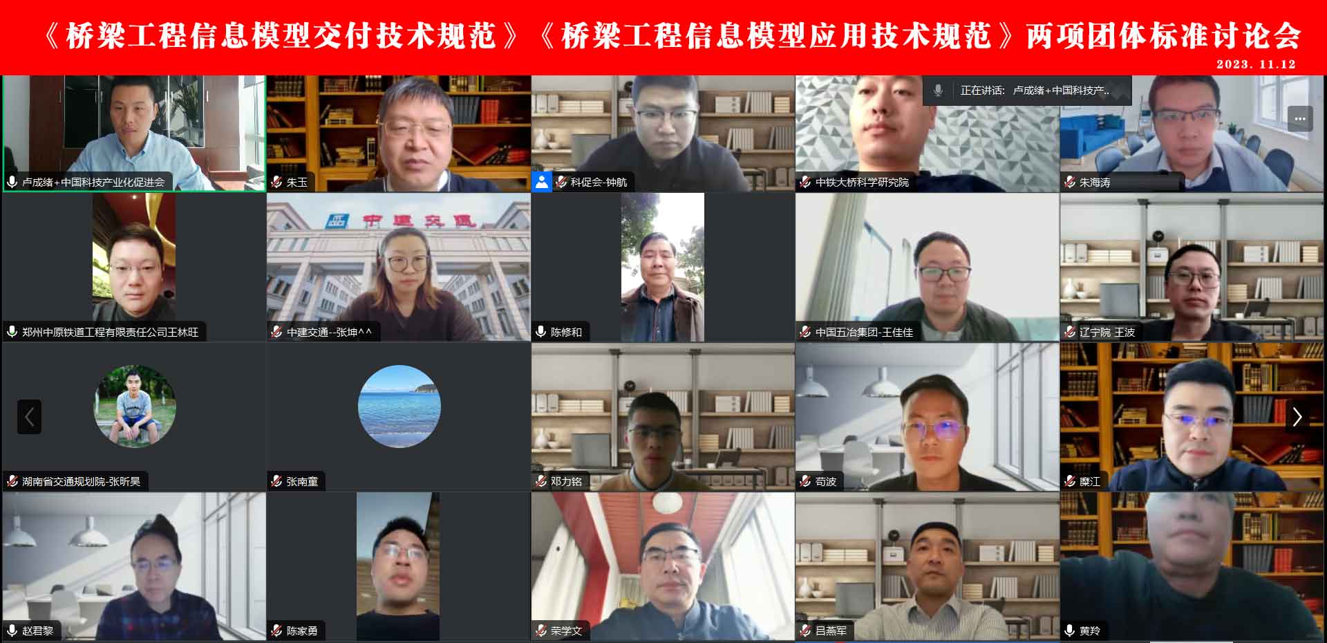 2023年11月12日,由江西省交通科学研究院有限公司牵头起草,在中国科技产业化促进会立项并归口的《桥梁工程信息模型交付技术规范》《桥梁工程信息模型应用技术规范》团体标准研讨会通过线上会议形式召开。